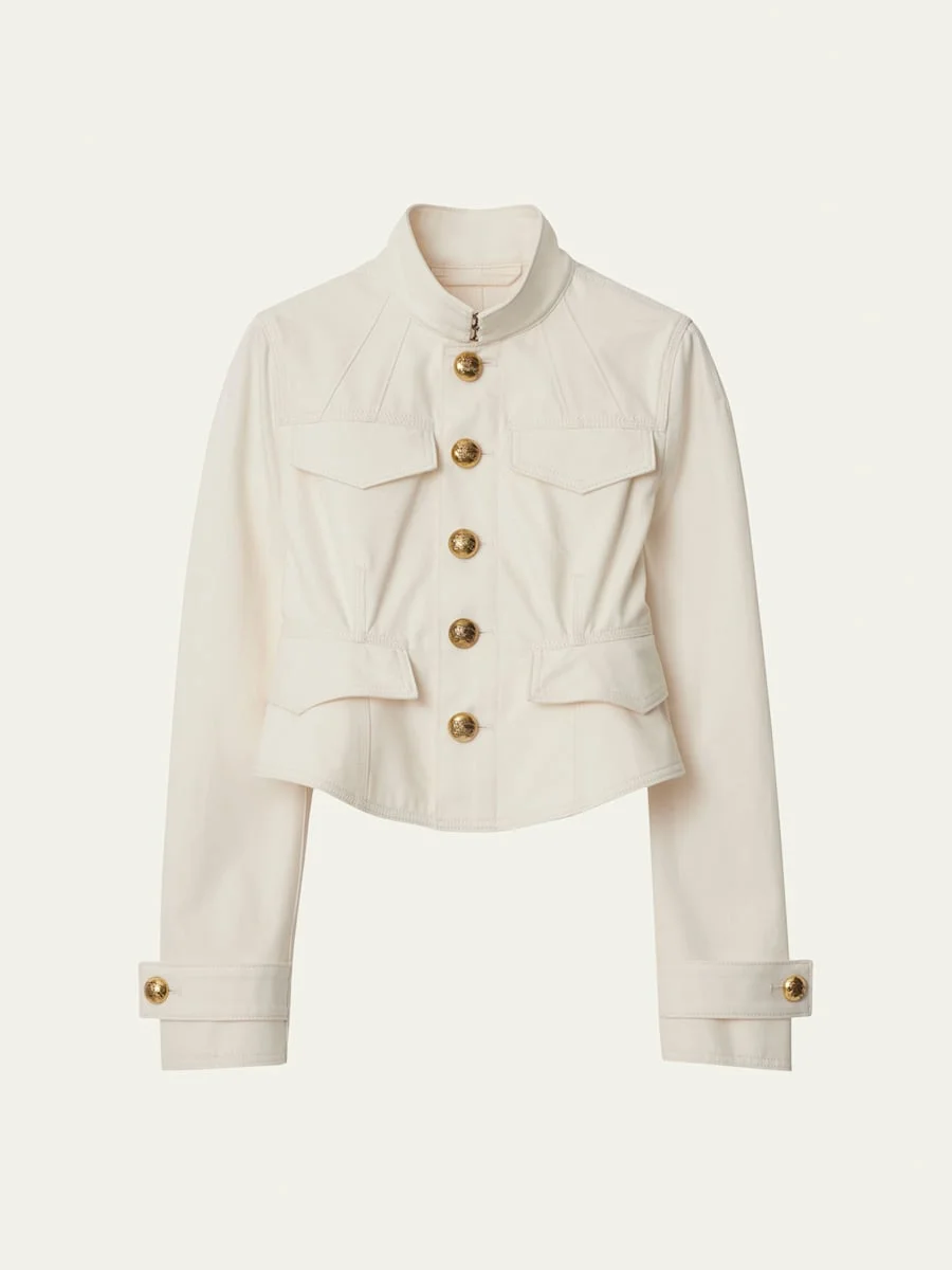 Burberry tailored jacket made from cotton twill with darted seams at the neckline Stand-collar; hook-and-eye collar closure Button closure Long sleeves; button-tab cuffs Chest and side flap pockets Slim fit Cropped length Curved hem Cotton self/lining Made in Italy Online Inquiries: BGS21_B9X7D| Store Inquiries: #4992249