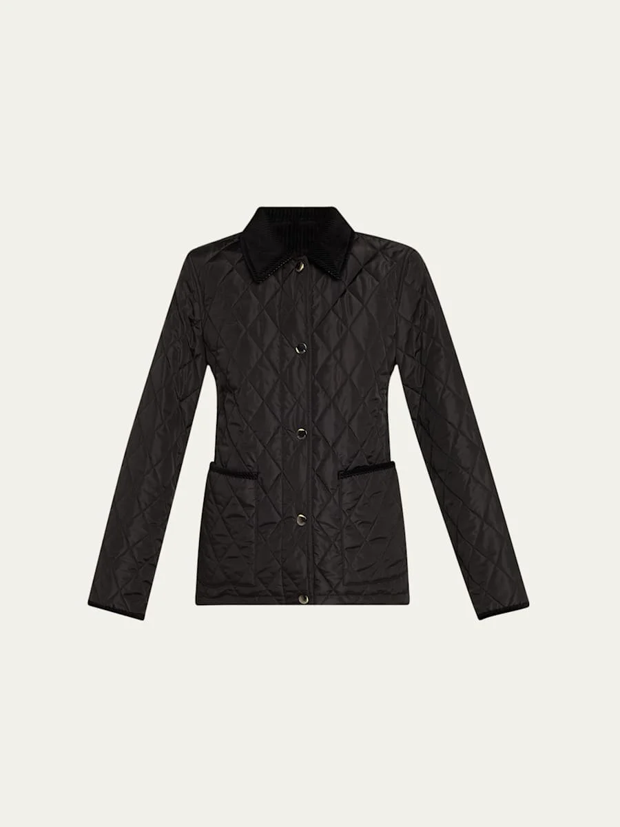 Burberry "Dorset" quilted barn jacket fetauring a corduroy collar and trim and a signature check lining Point collar; snap front Long sleeves Front patch pockets Straight fit Nylon/polyamide/cotton Lining: Cotton Dry clean Imported Online Inquiries: BGS21_BA6Y5| Store Inquiries: #5043187