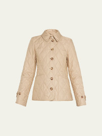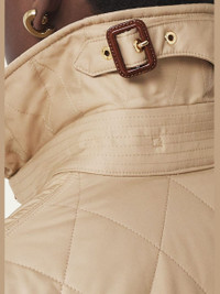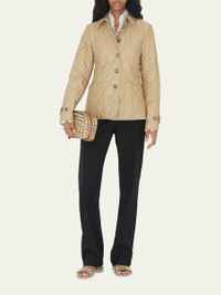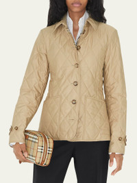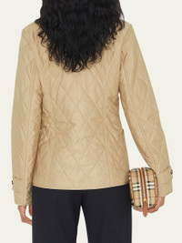 A diamond-quilted jacket cut to a slim fit. The design is lined in our signature Vintage check and engineered with 37.5® thermoregulation technology to accelerate evaporation and breathability, so you never feel too hot or cold. The main material of this product is made with at least 70% recycled content. Slim fit Jacket length: 65cm/25.6in. This is based on a size UK S as proportions change slightly according to size. Model’s height: 180cm/5ft 11in. Model wears size UK S. Outer: 100% polyester Trim: 100% leather Lining: 70% cotton, 30% polyester Filling: 100% polyester Single-breasted closure Patch pockets, interior button-through patch pocket Signature details: hook-and-eye collar closure, button-tab cuffs Specialist dry clean Imported Model is 5'10"/177cm. Online Inquiries: BGS21_B70Q1| Store Inquiries: #4259106