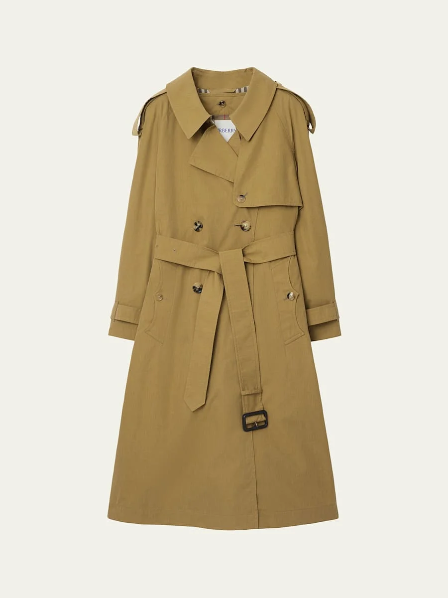 Burberry "Fitzrovia" classic trench coat boasts a looser cut with a relaxed, Aline fit. Two curlicueshaped flap pockets inspired by an archival design complete the style. Notched lapels Long raglan sleeves with belted cuffs Shoulder epaulettes Belted waist Two side buttonflap pockets Back vent Doublebreasted front closure Polyester/cotton Lining: Cupro/cotton Dry clean Made in Poland