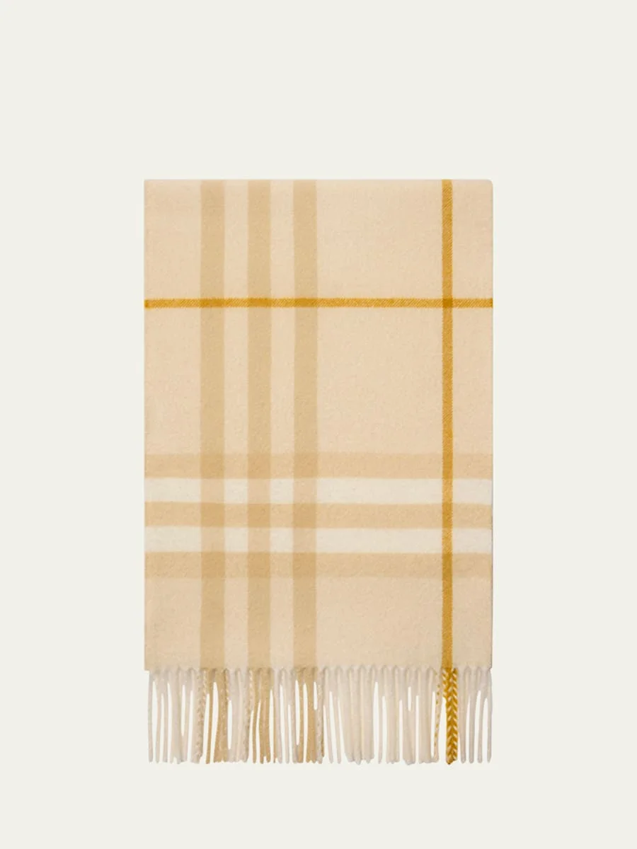 Burberry Giant Check scarf boasts a natural luster and ultra-soft finish Approx. 11.8"W x 66.1"L Fringed edges Cashmere Professional cleaning recommended Made in United Kingdom Online Inquiries: BGS21_D5ALL| Store Inquiries: #5044151