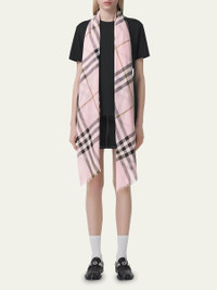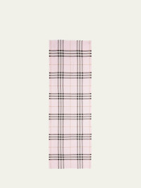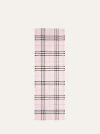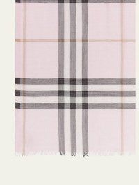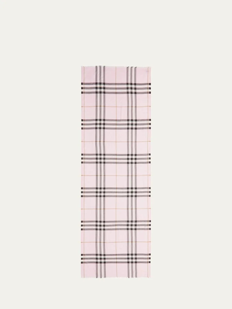 An Italian-made check wool and silk scarf in a lightweight gauze weave Burberry giant check scarf in a lightweight gauze weave. Approx. 86.6" x 27.6" (220 x 70cm). Lightweight, seasonless fabric. May be styled multiple ways. Eyelash fringing at both ends. Wool/silk. Dry clean. Made in Italy. Online Inquiries: BGS21_D4WH4| Store Inquiries: #3421697