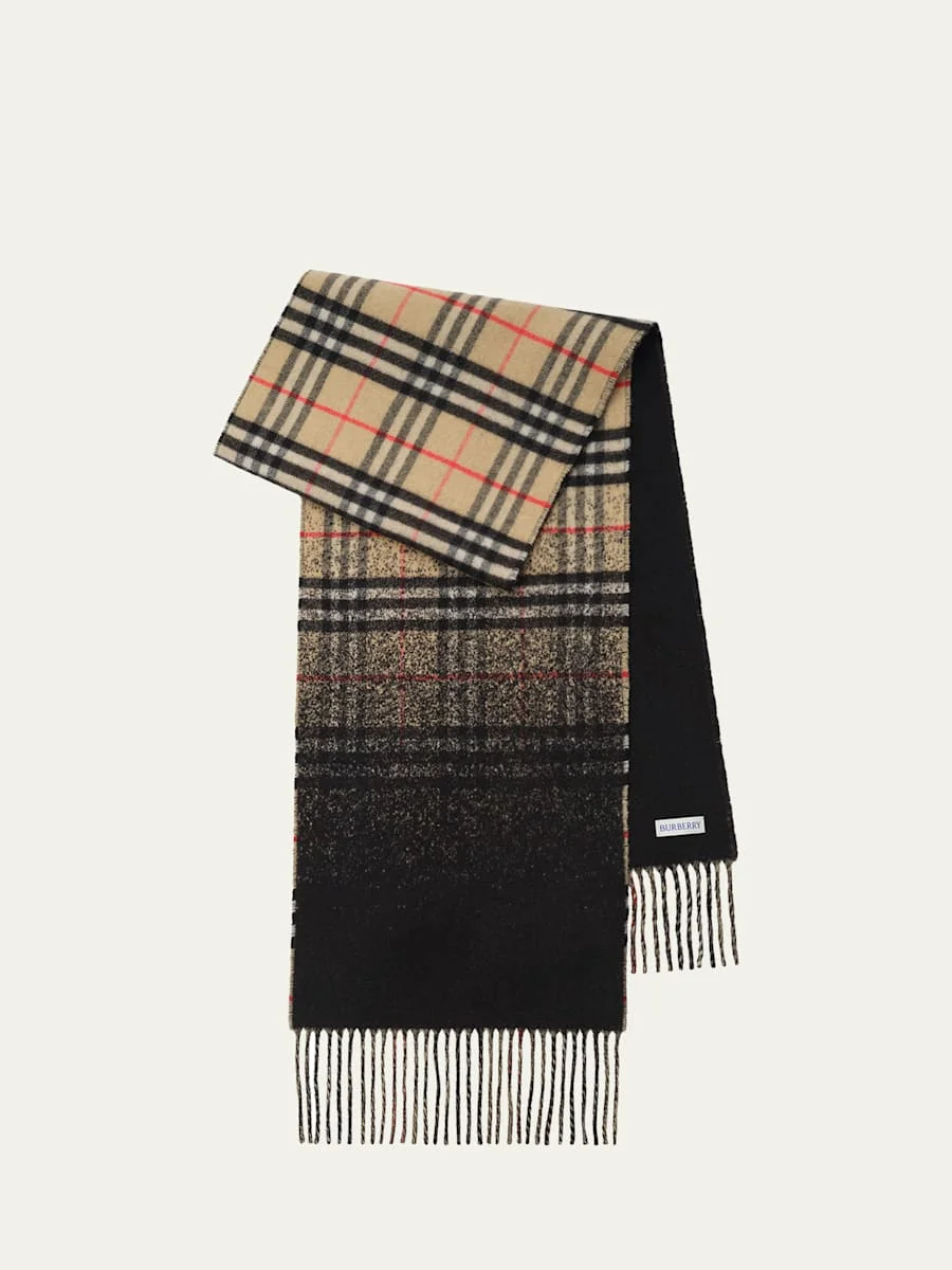 Burberry doublefaced cashmere scarf, jacquardwoven with a subtle gradient that blends the house's iconic check into a solid hue. Approx. 66.1"L x 11.8"W Rectangular Fringing at both ends May be styled multiple ways Cashmere Dry clean Imported