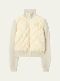 Burberry "Kelsey" jacket is crafted of a quilted nylon bodice with wool knit sleeves combo adorned with a signature EKD logo embossed leather patch on the chest Stand collar; two-way zip front Long sleeves Hip zip pockets Slim fit Hip length Ribbed cuffs and hem Nylon/polyamide/wool/elastane Lining: Nylon Fill: Polyester, feather/down Trim: Leather Machine wash Imported Online Inquiries: BGS21_BB5PM| Store Inquiries: #5498749