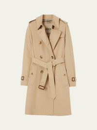 Burberry "Kensington" organic water-resistant gabardine trench coat featuring signature check lining and undercollar Trench collar with throat latch; double-breasted front Long sleeves; belted cuffs Chest gun flap; back rain shield Belted waist Shoulder epaulets Side flap pockets Straight fit Knee length Center-back vented hem Organic cotton Made in United Kingdom Model is 5'10"/177cm. Online Inquiries: BGS21_B91BU| Store Inquiries: #4719987