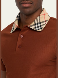 This Burberry polo shirt is crafted from lightweight cotton pique, cut to a slim fit, and knitted with the iconic Check on the collar. Check collar Threebutton placket Vented sides Pullover style Slim fit Cotton Made in Portugal