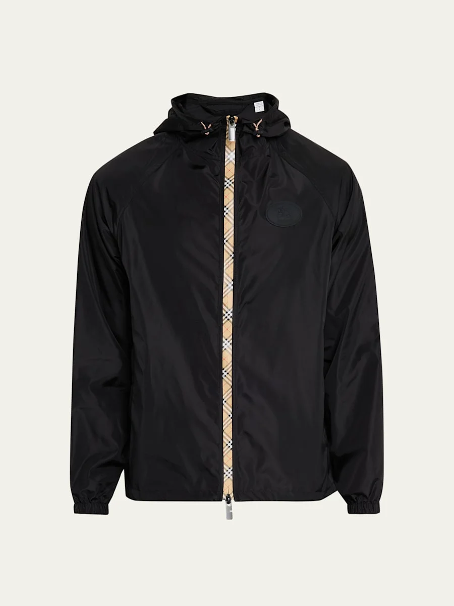 This lightweight hooded jacket from Burberry is woven in nylon, finished with iconic Check taping and luxurious Bcut zip pulls. Tonal Knight stamp applique on the chest, an archival motif first seen on Burberry bags in the 1980s Drawcord hood and hem Twoway zip closure Bcut zip pulls Side zip pockets Elasticated cuffs Silicone Equestrian Knight Design chest patch Includes a premium garment bag Relaxed fit Nylon/polyamide Imported