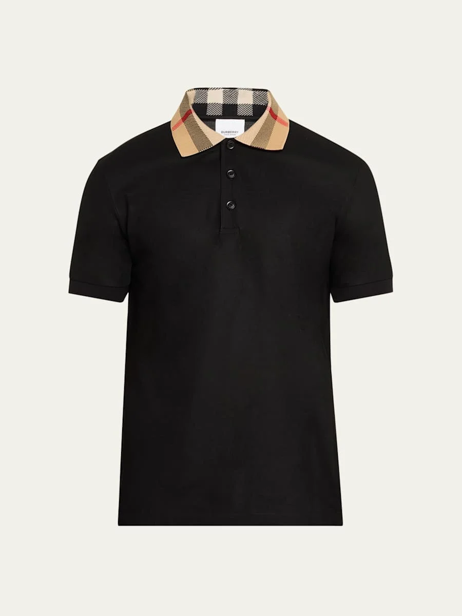 Burberry "Cody" polo shirt with signature check collar Three-button placket Cuffed short sleeves Pullover style Cotton Made in Portugal Model is 6'1"/185cm. Online Inquiries: BGS21_NB20Z| Store Inquiries: #4567141