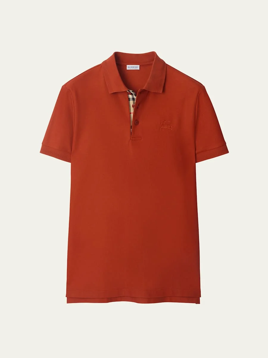 Burberry polo shirt made from cotton pique, embroidered with a tonal Equestrian Knight Design on the chest for a distinctive, yet discreet touch Signature Check lining on the placket Spread collar Three-button placket Ribbed cuffs Uneven vented sides Pullover style Slim fit Cotton Imported Online Inquiries: BGS21_NDTHQ| Store Inquiries: #5082716