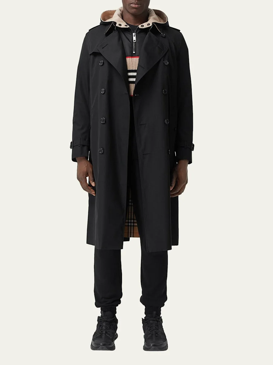 Burberry "Kensington" trench coat in gabardine with signature check lining. Trench collar with check undercollar and throat latch. Double-breasted button front. Long sleeves; belted cuffs. Button side pockets. Epaulets; gun flap; rain shield. Walking vent. Cotton. Dry clean. Made in United Kingdom. Model is 6'1"/185cm. Online Inquiries: BGS21_N7KG9| Store Inquiries: #3685431