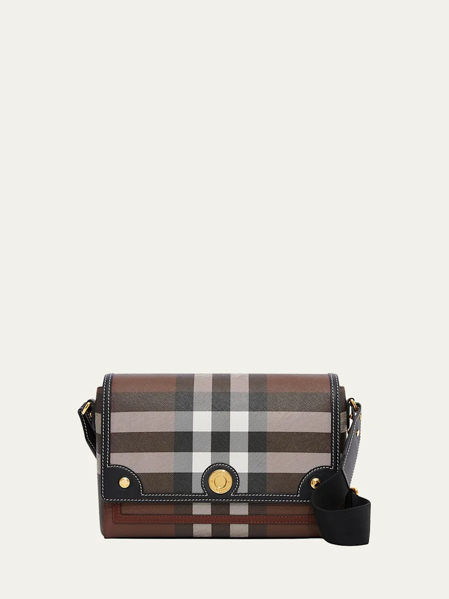 A slim crossbody bag in Exaggerated Check and topstitched leather, accented with polished logo-engraved press-studs and a detachable strap. Wear on the shoulder, across the body or carry as a clutch. The main material of this product is made with at least 30% bio-based materials. Bio-based materials are derived from renewable natural resources such as plants and castor oil. Burberry crossbody bag in giant check e-canvas cotton, faux leather (polyurethane), and topstitched calf leather Check e-canvas is an environmentally conscious canvas, primarily made using renewable resources that require less water and generate less CO2 than conventional coated canvases Features polished logo-engraved press-studs Adjustable web crossbody strap; 15"-23.2" drop Wear on the shoulder, across the body, or carry as a clutch Flap top with magnetic closure Exterior, one slip pocket under flap Interior, one slip pocket Lining: Cotton/polyester Approx. 7.1"H x 9.8"W x 3.3"D Made in Italy Online Inquiries: BGS21_V5QJ4| Store Inquiries: #4456093
