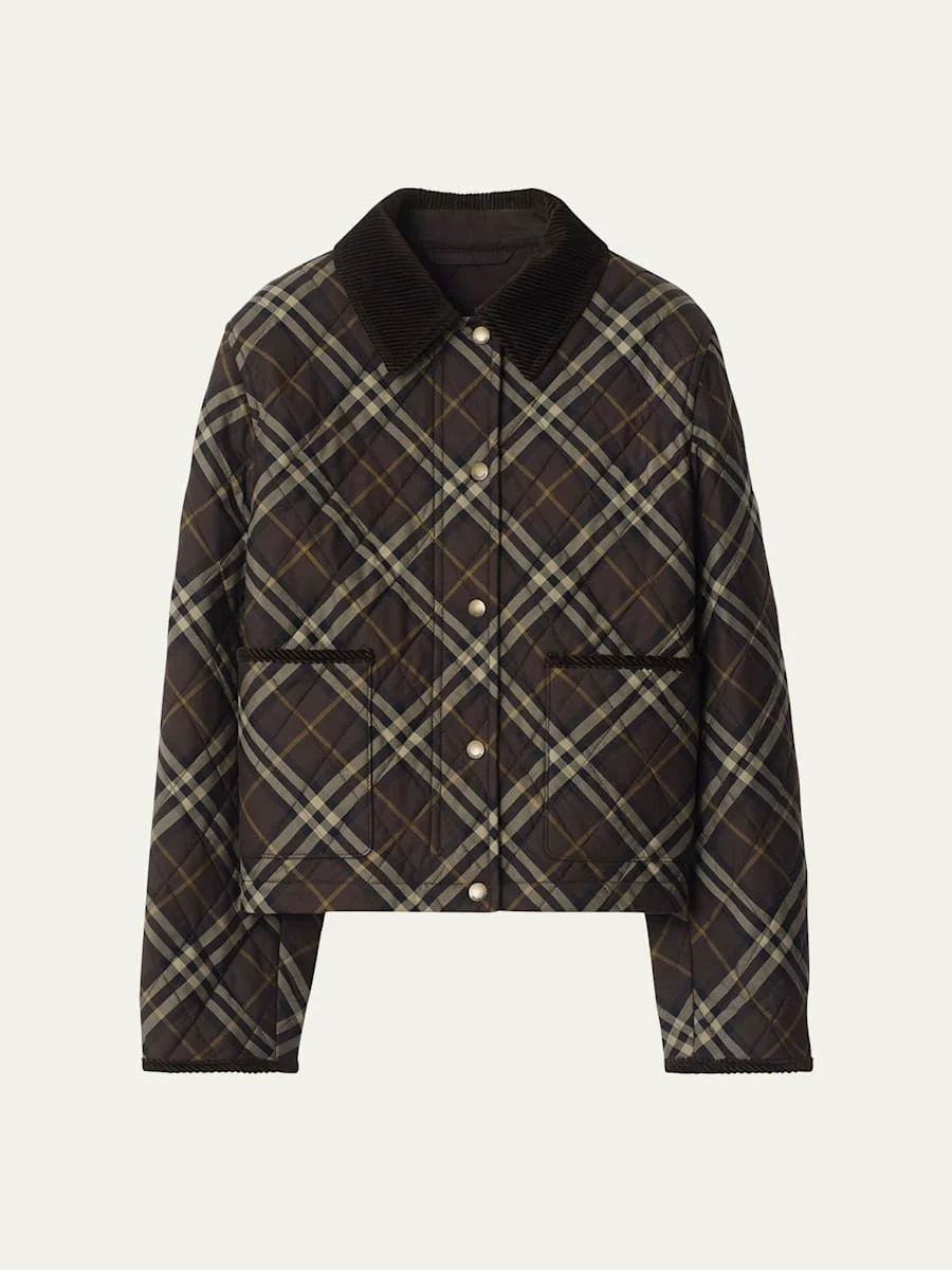 Burberry "Oldham" quilted barn jacket pairs classic checks with plush corduroy trim, delivering a refined nod to countryside charm in a modern profile. Point collar; snap front closure Long sleeves Hip patch pockets Straight fit Hip length Cotton Lining: Cotton Made in United Kingdom Online Inquiries: BGS21_BB1YA| Store Inquiries: #5444395