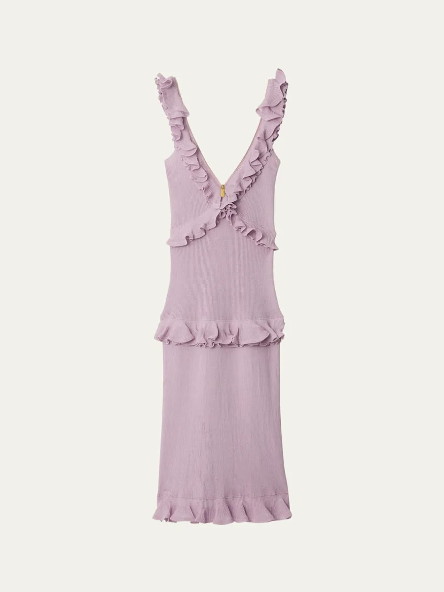 Burberry ribbed knit dress featuring crossover ruffle bodice and a tiered ruffle skirt V neckline Sleeveless Sheath silhouette Full length Back zip Silk/nylon/polyamide/elastane Lining: Silk Dry clean Made in Italy Online Inquiries: BGS21_B9VWD| Store Inquiries: #4984650
