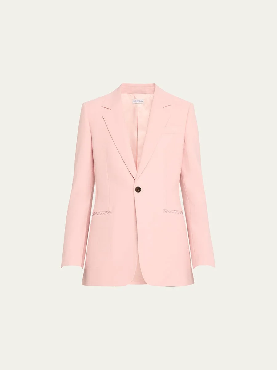 Burberry slim-fit blazer jacket in wool Notched lapel collar Single button front Long sleeves Front welt pockets Mid-length Wool Lining: Viscose Dry clean, professional cleaning recommended Made in Italy Model is 5'10"/177cm. Online Inquiries: BGS21_B8ZPU| Store Inquiries: #4705980