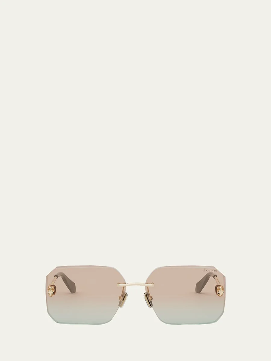 BVLGARI "Serpenti Forever" rimless geometric square sunglasses in metal Lens/bridge/temple (in mm): 62-14-140 Solid lenses; embellished snakeheads Adjustable nose pads Thin, tapered arms Hand wash 100% UVA/UVB protection Made in Italy Proposition 65 warning for California residents Online Inquiries: BGS21_D5E1C| Store Inquiries: #4806997