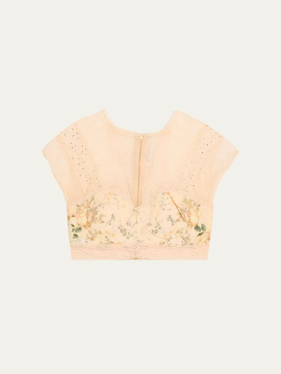 Camilla handcrafted top features a fitted bodice with sheer lace panels amongst a bespoke printed bust High neckline Short sleeves Cropped length Fitted Center back zip Silk Dry clean Imported Model is 5'10"/177cm. Online Inquiries: BGS21_T60DG| Store Inquiries: #4875461