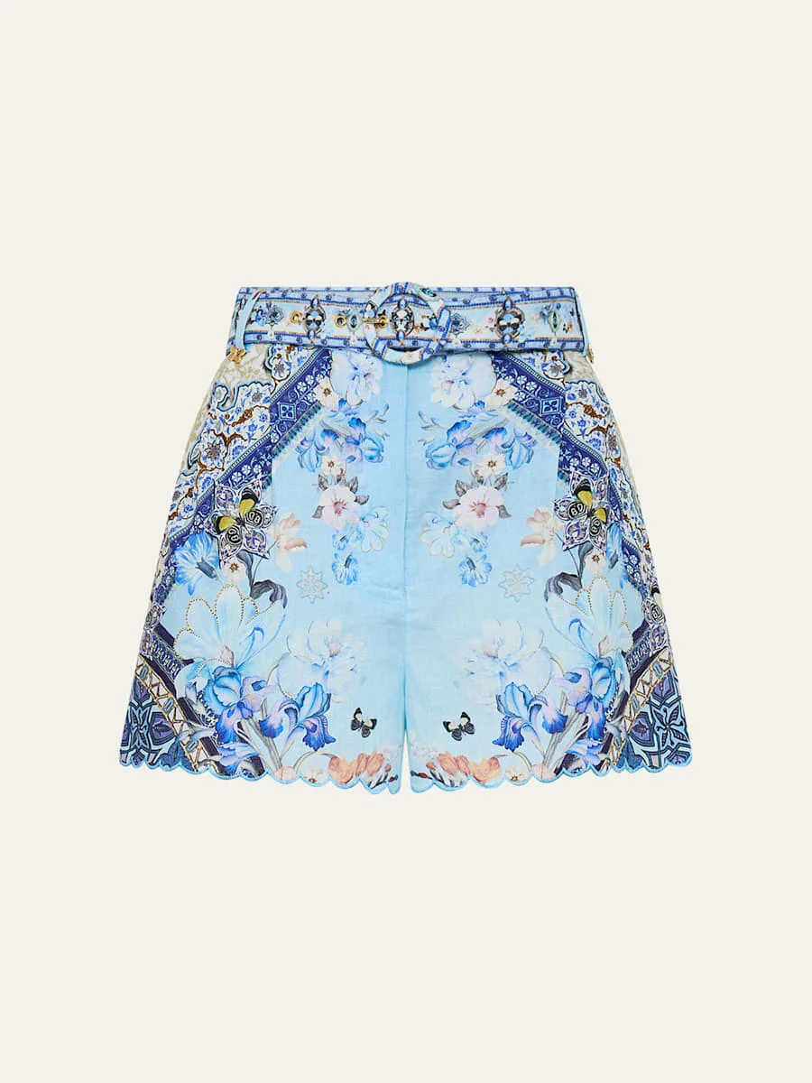 Camilla linen shorts featuring an Al Manial Palace Memoirs print High rise Belted waist Pleated front Side pockets A-line fit Hook/zip fly; belt loops Linen Imported Online Inquiries: BGS21_T66LN| Store Inquiries: #4916267