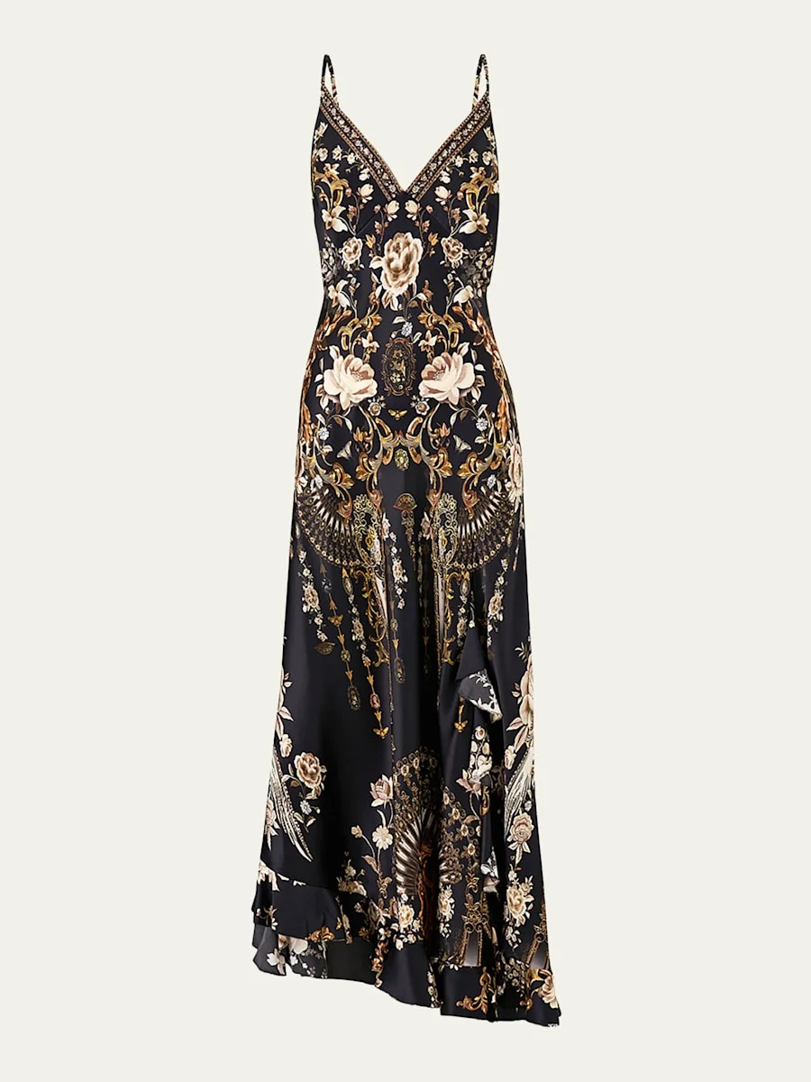 This biascut slip dress by Camilla is handcrafted from lustrous silk in an exclusive, limitededition print with crystal embellished accents and asymmetric frills V neckline Adjustable straps Splitfront hem Full length Bodyskimming silhouette Slipover style Silk Dry clean Imported SIZE amp; FITModel measurements: 5'10" tall Model is wearing a US size 4/Small
