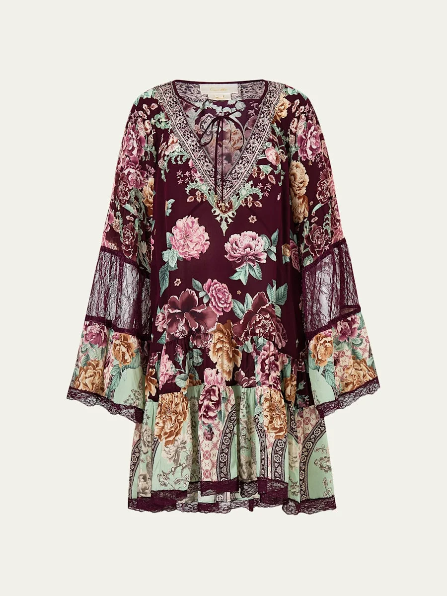 This handcrafted dress by Camilla is designed in a paneled construction with vibrant floral prints, sheer lace, and crystal embellishments V neckline with optional selfties Flared long sleeves Hem hits around the knee Aline silhouette Slipover stye Silk Imported
