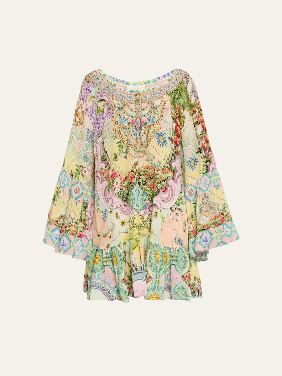 Lovingly handcrafted in a pastel kaleidoscope print, this Camilla dress is finished with crystal embellishments Can be worn on or off the shoulder Elasticated wide scoop neckline Long flared sleeves Ruffled hem falls above the knee A-line silhouette Slipover style Organic cotton/pima cotton Imported Online Inquiries: BGS21_T6T0A| Store Inquiries: #5030779