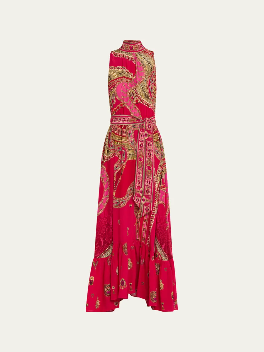 Camilla silk maxi dress featuring a self-tie neck and waist in an allover Kissed By A Cobra print High neckline Sleeveless A-line silhouette Tiered hem Slipover style Full length Silk Imported Online Inquiries: BGS21_T66LH| Store Inquiries: #4916262