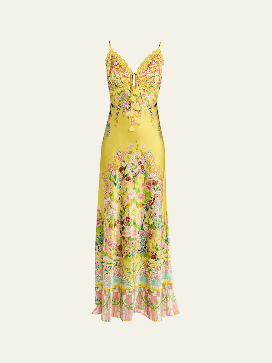 Handcrafted of silk in the brand's limitededition Lady Limonada print, this biascut dress by Camilla is finished with 3D floral lace trims and crystal embellishments V neckline with central selfties Sleeveless Full length Bodyskimming silhouette Slipover style Silk Imported SIZE amp; FITModel measurements: 5'10" tall Model is wearing a US size 4/Small