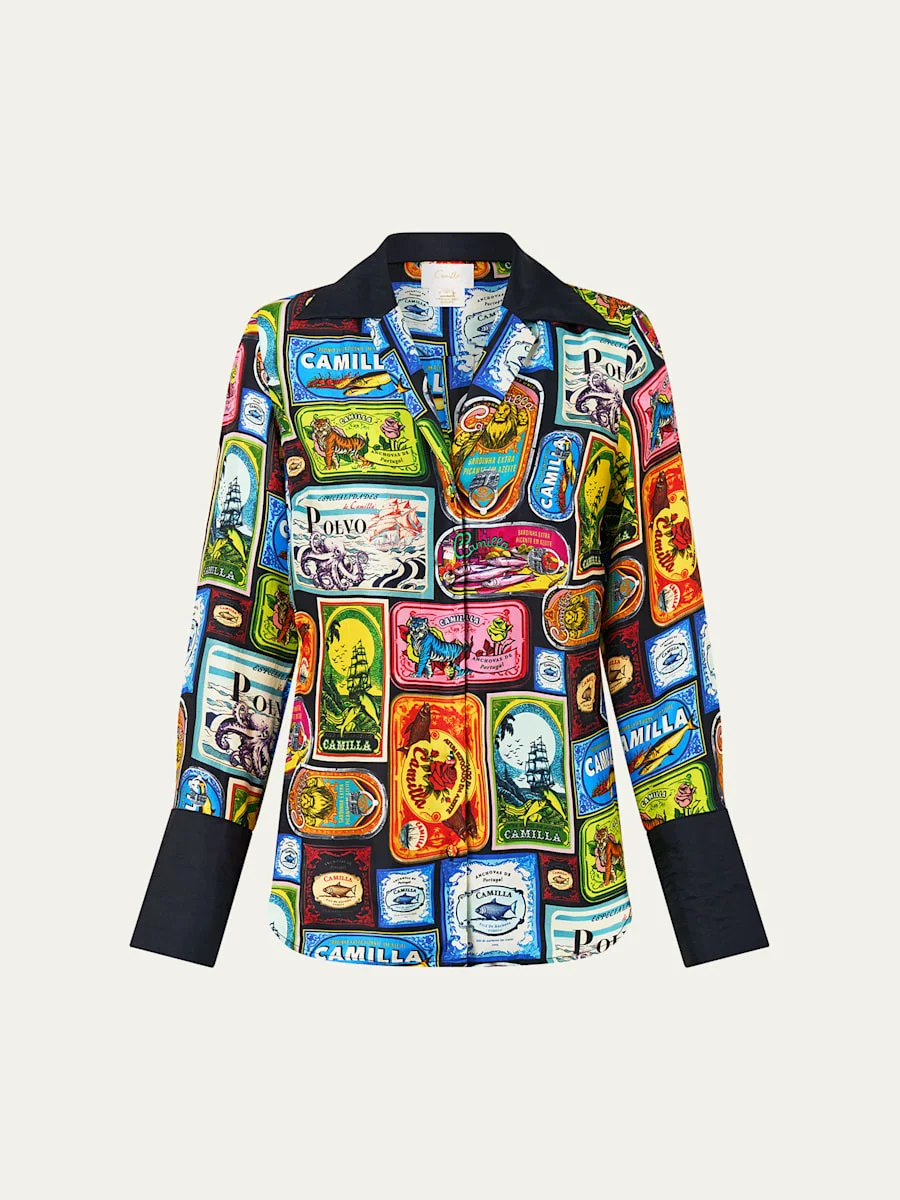 Camilla pajama-style silk twill shirt in Sal Do Mar sardine can print with crystal-embellished accents Collared neckline Long sleeves; wide button cuffs Yoked back Relaxed fit Hip length Button front closure Silk Imported Online Inquiries: BGS21_T6KK0| Store Inquiries: #4997425
