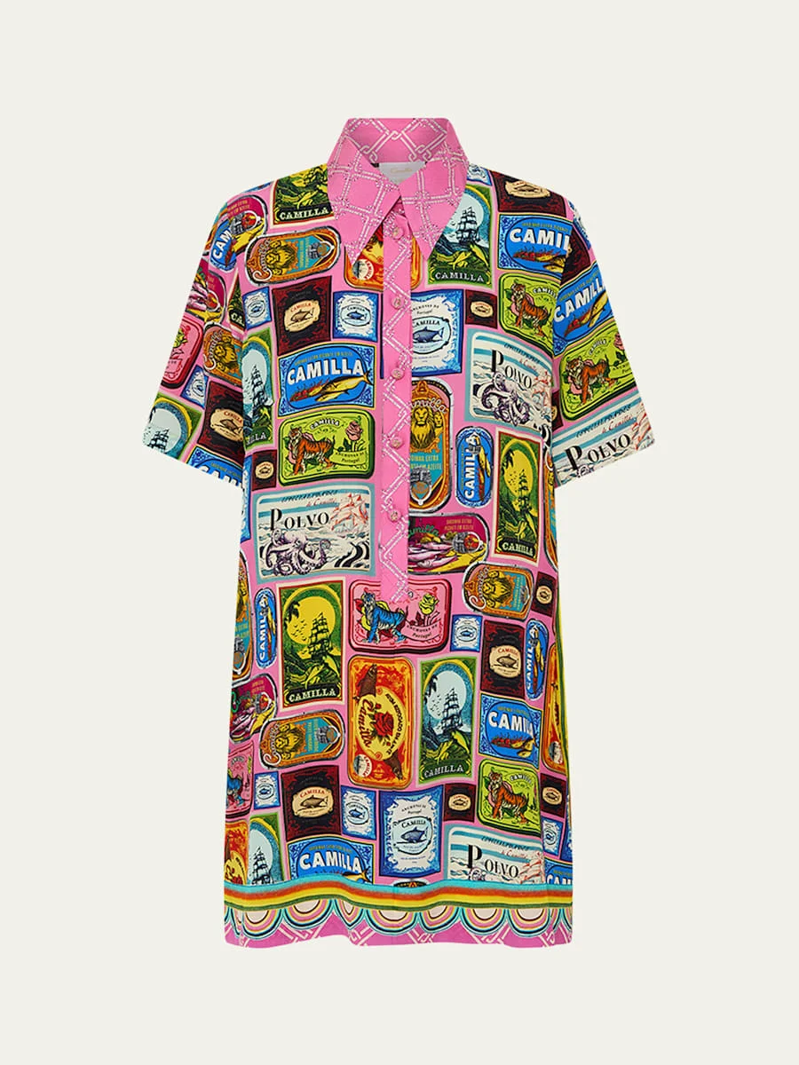Camilla lovingly handcrafted shirtdress in vibrant Salty Splendour print with crystalembellished detailing Point collar Half sleeves Side seam pockets Hem falls above the knee Aline silhouette Partial button front Silk Imported