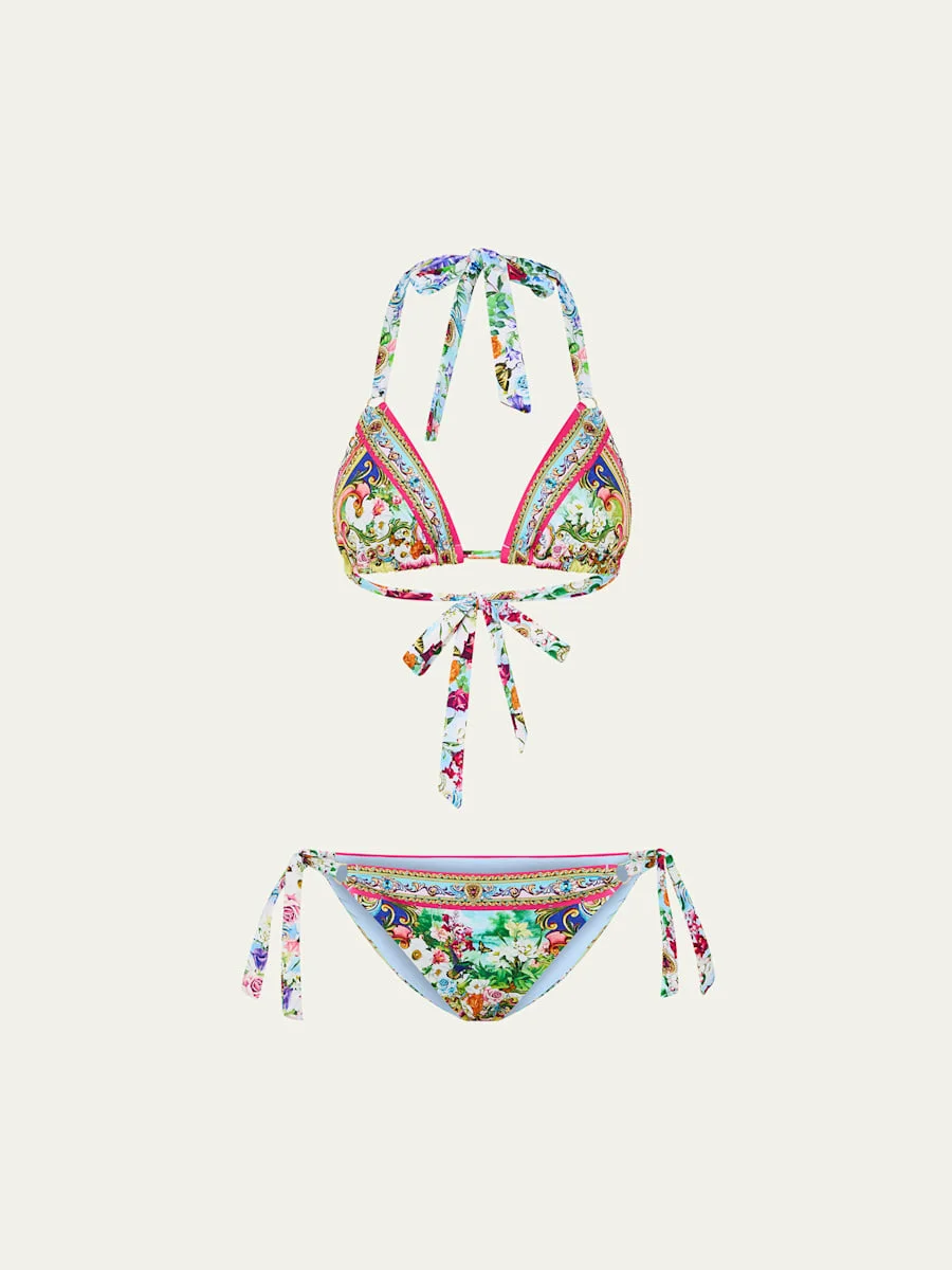 Camilla two-piece bikini set in Spirit of Santa Maria print with crystal-embellished accents throughout Halter neckline; self-ties behind the necj Triangle cups slide on string Mid-back self-ties Low rise Self-tie sides Cheeky seat coverage Nylon/polyamide/elastane Imported Online Inquiries: BGS21_T6T05| Store Inquiries: #5030776