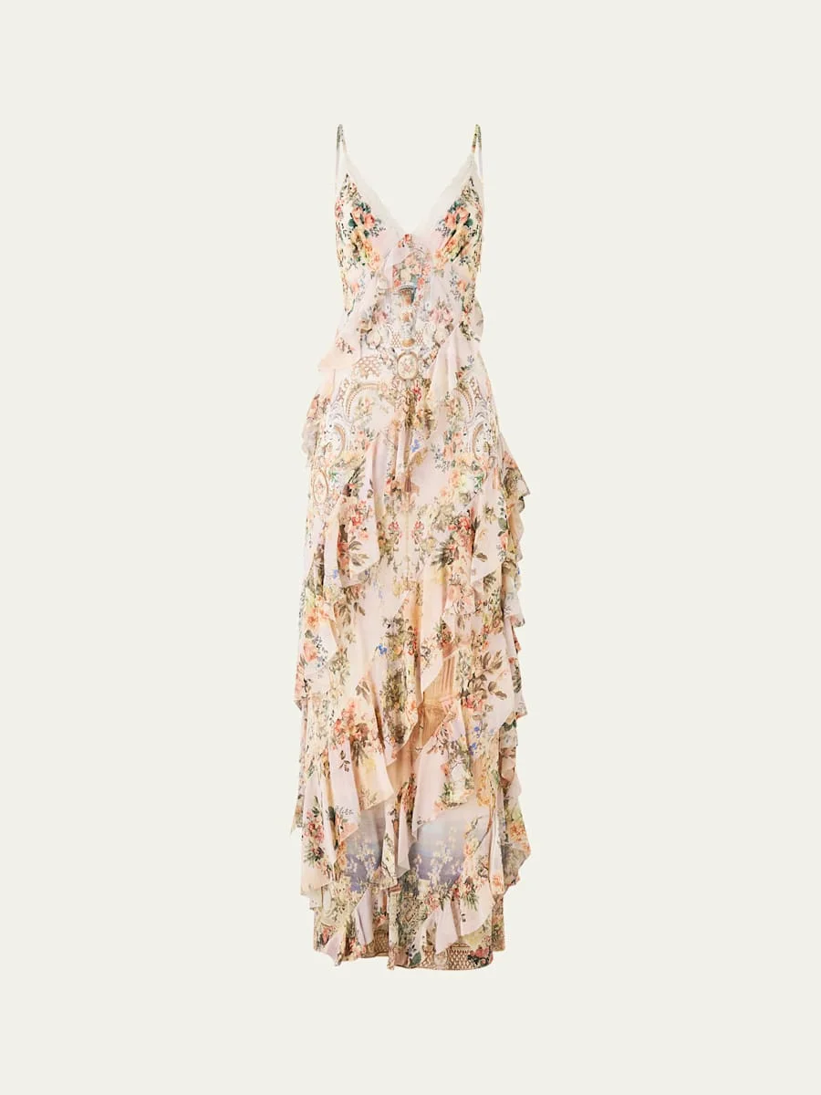 Finished with lace edge trim, this slip dress by Camilla features the label's limitededition Twilight in Istanbul print and asymmetric waterfall ruffles V neckline Sleeveless Full length Biascut skirt Slipover style Linen Dry clean Imported
