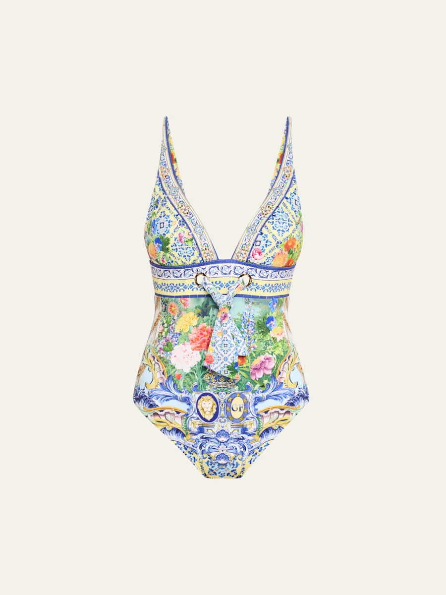 Camilla one-piece swimsuit features a Wall to Wall Wonders print and front eyelet ties V neckline balances figure Adjustable straps Moderate coverage Nylon/polyamide/elastane Imported Online Inquiries: BGS21_T6JX4| Store Inquiries: #4993675