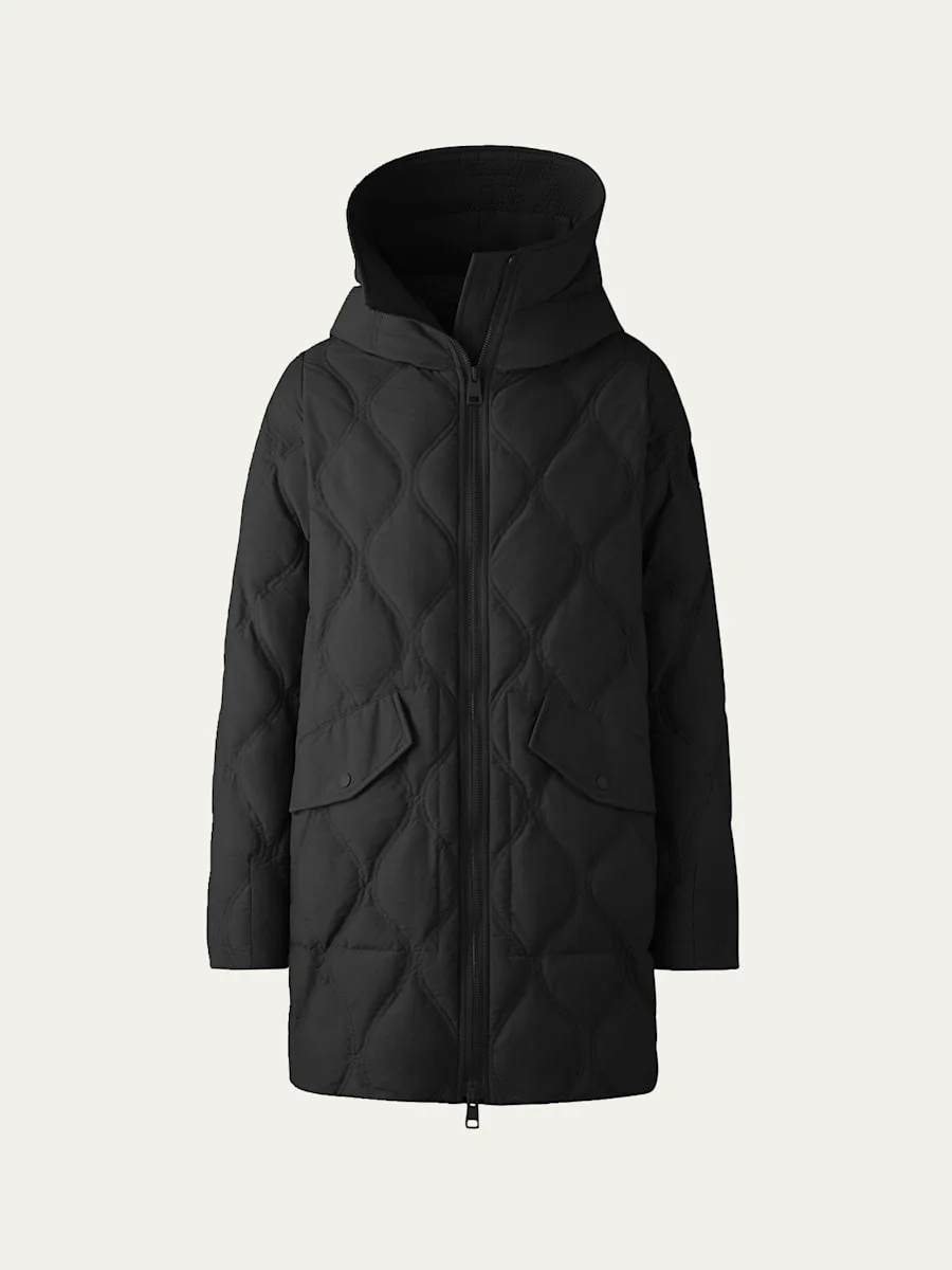 Crafted from cotton nylon Mini-Ripstop with heritage-inspired quilting, the "Alessia" coat by Canada Goose features a fixed hood and interior backpack straps for hands-free carrying. Cold weather protection down to 5°F. Hooded neckline; two-way zip-front Long sleeves Signature logo patch on the left sleeve Patch pockets; side seam zip pockets Loose fit Mid-thigh length Cotton/nylon/polyamide Fill: Down/feather Lining: Nylon Machine wash cold, inside out Made in Canada Online Inquiries: BGS21_T6YAS| Store Inquiries: #5065456