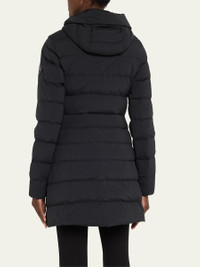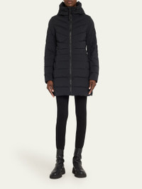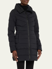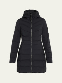 Canada Goose "Clair" puffer coat Fixed snorkel hood with hidden cord lock adjuster Twoway center front zipper for added range of motion and venting Sueded tricot chin guard adds softness and comfort Shoulder logo patch Long sleeves with power stretch cuffs Interior backpack straps allow the jacket to be carried handsfree over the shoulders 2 exterior fleecelined hand warmer pockets with zipper closures 1 interior security pocket with zipper closure Hem falls above the knee Straight fit Nylon/polyamide/spandex Lining: Nylon/spandex Feather/down fill Machine wash cold Made in Canada Size Note: Item runs small, consider ordering a size up. Model height: 5'10"/177cm.