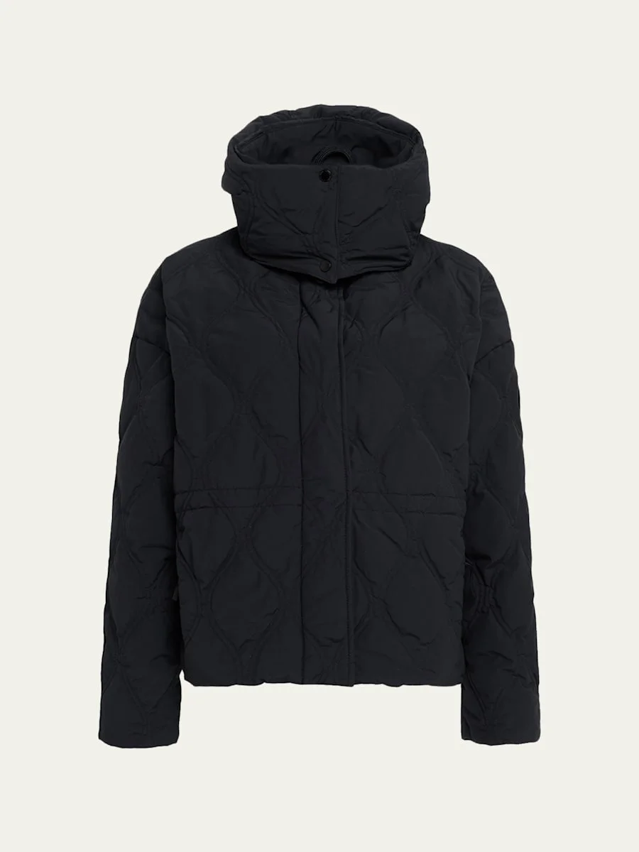 A bold silhouette, the "Claremont" bomber jacket by Canada Goose is crafted in signature recycled organic Arctic Tech® fabric with a waterrepellent finish for protection without compromising style. Cold weather protection down to 5°F. Hooded neckline with zips for a split collar Long ruched sleeves with ribknit cuffs Signature logo patch on the left sleeve Adjustable drawcord waist Chest pockets; lower flap pockets Relaxed fit Ribknit hem Contrast placket over twoway zip Polyester/cotton Fill: Down/feather Lining: Nylon Dry clean Made in Canada