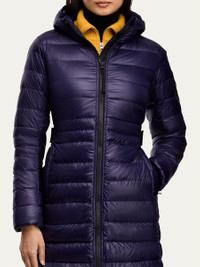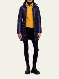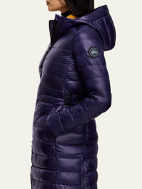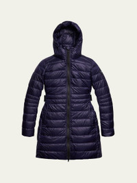 Canada Goose "Cypress" lightweight channel-quilt jacket Hooded collar; two-way zipper Long sleeves; black disc at left arm Packable into the interior left pocket Exterior loops provide backpack straps for hands-free carry Pockets at sides Above-knee length Recycled nylon Lining: recycled nylon Fill: down Made in Canada Online Inquiries: BGS21_T8SHL| Store Inquiries: #4265086