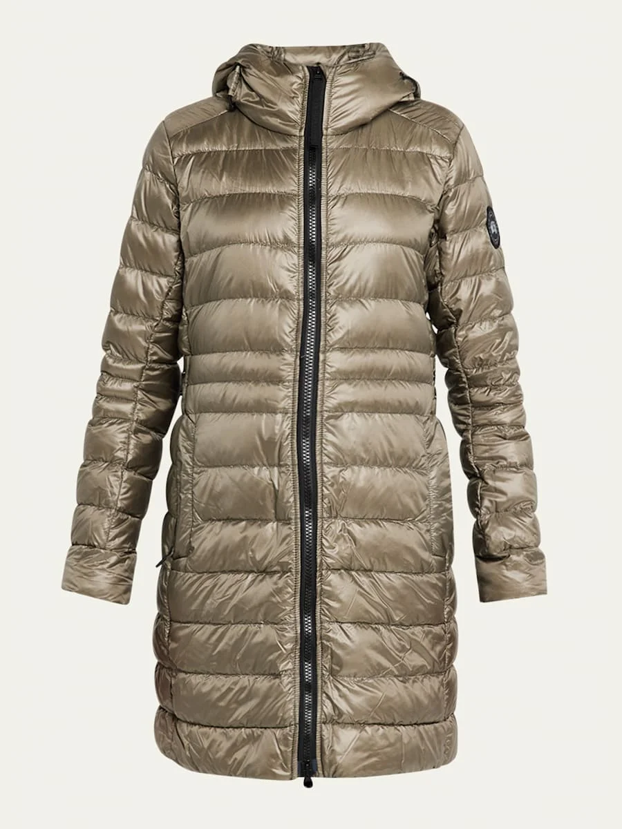 Canada Goose "Cypress" lightweight channel-quilt jacket Hooded collar; two-way zipper Long sleeves; black disc at left arm Packable into the interior left pocket Exterior loops provide backpack straps for hands-free carry Pockets at sides Above-knee length Recycled nylon Lining: recycled nylon Fill: down Made in Canada Model is 5'10"/177cm. Online Inquiries: BGS21_T6A4T| Store Inquiries: #4265086