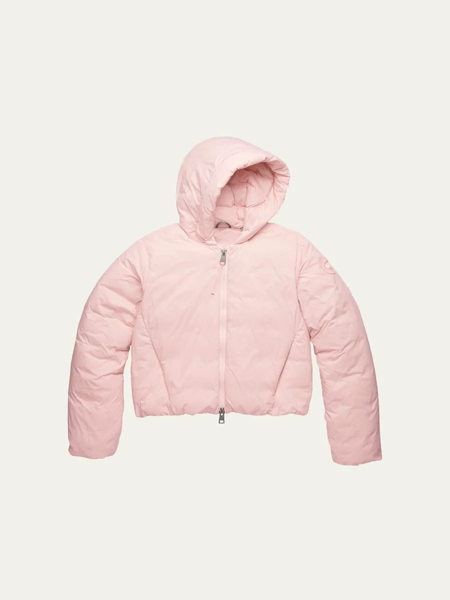 Designed with a minimalist silhouette in ultra-lightweight Lumina, the "Elba" puffer jacket by Canada Goose offers ease without compromising warmth.  Cold weather protection down to 5°F. Packable into left interior pocket with carrying strap. Hooded neckline; two-way zip-front  Long sleeves  Signature logo patch on the left sleeve  Side zip pockets Classic fit Elasticized drawcord hem  Nylon/polyamide Fill: Feather/down Lining: Nylon Machine wash cold inside out Imported Online Inquiries: BGS21_T6YAL| Store Inquiries: #5065447