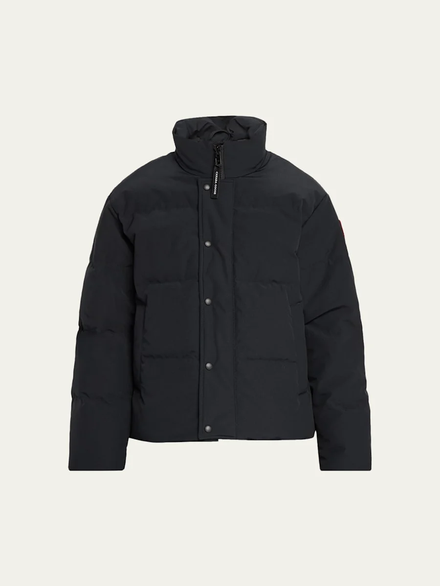 The "Bayview" parka from Canada Goose is crafted from Recycled Organic Arctic Tech® fabric for a drytouch, waterrepellent finish. Backpack straps for handsfree carrying Stand collar; lined chin guard Snapconcealed twoway zip front Fleecelined side pockets; snap closures Two inner mesh pockets; one zip pocket Disc logo on the left sleeve Long sleeves Ribbed cuffs Hip length Regular fit Polyester/organic cotton Down/feather fill Dry clean Temperature rating: 32°F to 5°F Made in Canada