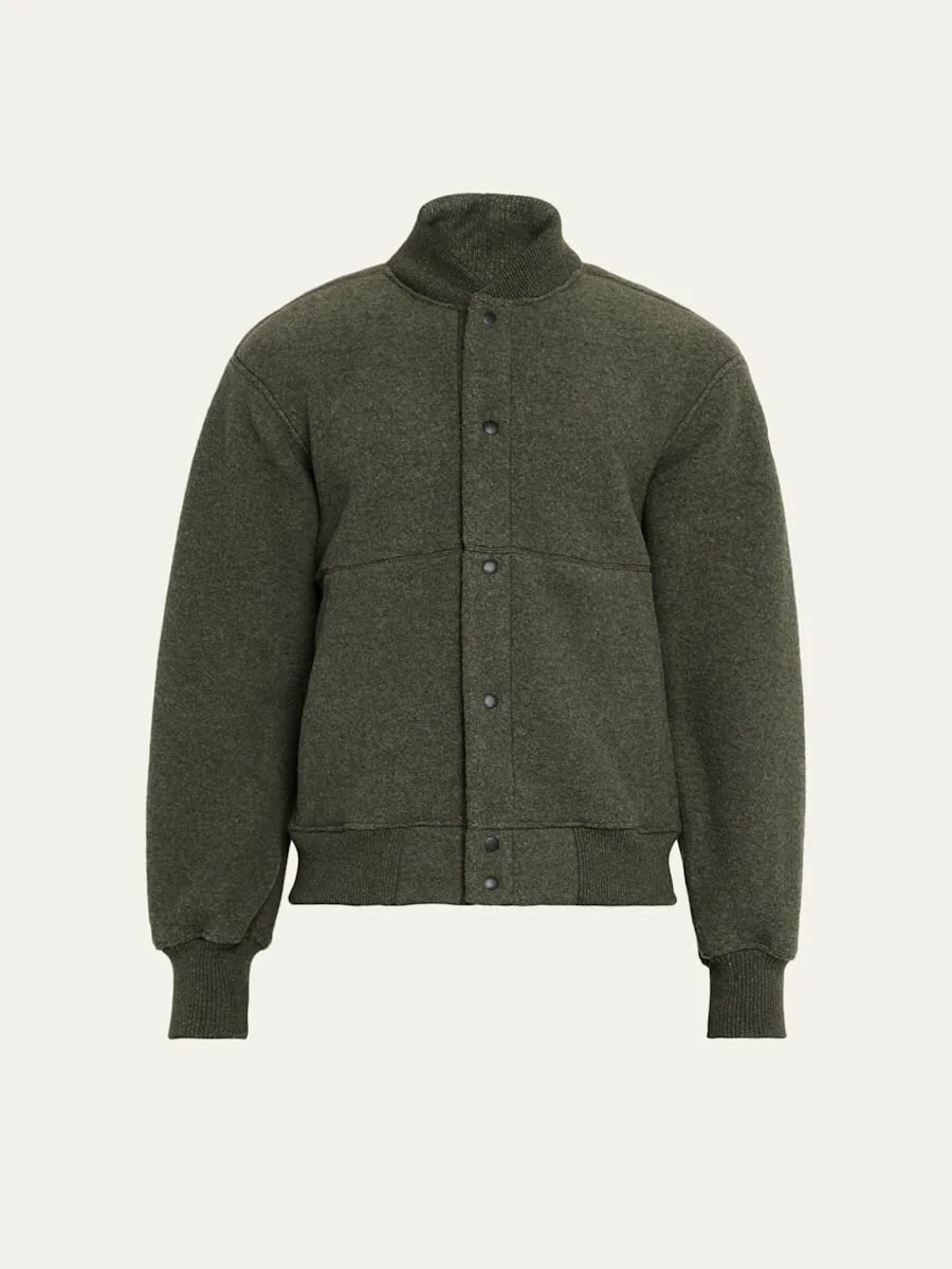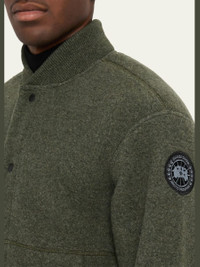The "Hudson" jacket by Canada Goose is inspired by varsity bomber jackets, crafted from Kind Fleece, resulting in a cozy and breathable finish Ribbed baseball collar Snap front Two lined side zip pockets Ribbed cuffs and hem Left sleeve logo patch Dry clean only Wool/lyocell/polyester Made in Canada