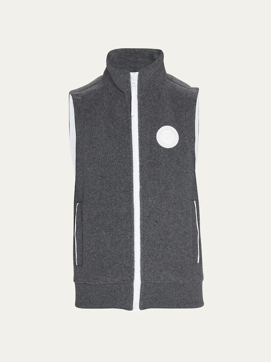 Canada Goose "Mersey" fleece vest with contrast trim Stand collar; two-way zip front closure Logo patch at chest Side welt pockets Sleeveless Ribbed hem Wool/polyamide/Tencel® lyocell Made in Canada Model is 6'1"/185cm. Online Inquiries: BGS21_N9B3F| Store Inquiries: #4328062