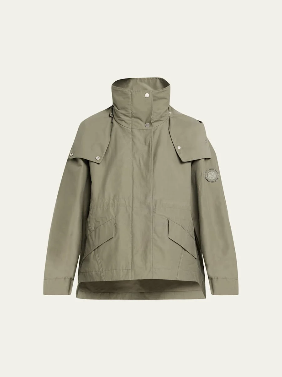 Crafted in a mid-weight twill fabric that is water-repellent and wind-resistant, the "Olivine" jacket by Canada Goose features a dramatic high collar for a bold statement without compromising warmth. Cold weather protection down to 23°F. Removable wrap-around hood Long sleeves with snap elastic cuffs Signature logo patch on the left sleeve Interior adjustable drawcord waist Flap pockets Oversized fit Two-way zip-front with snap placket Cotton/polyester/nylon/polyamide Dry clean Imported Online Inquiries: BGS21_T6YB6| Store Inquiries: #5065484
