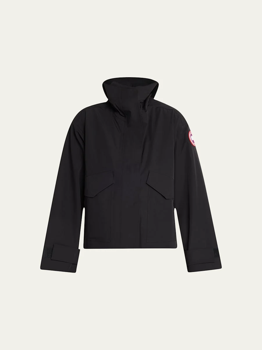 Canada Goose "Tofino" rain jacket crafted from flexible threelayer fabric for breathable comfort Waterproof and windproof Hooded neckline with adjustable drawcord Long sleeves with adjustable cuffs Signature logo patch at left sleeve Flap pockets with zip closures One interior zip pocket Slight cropped fit Twoway zipfront with snapover placket Nylon/polyamide/elastane Lining: Recycled polyester Machine wash cold, line dry Made in Portugal