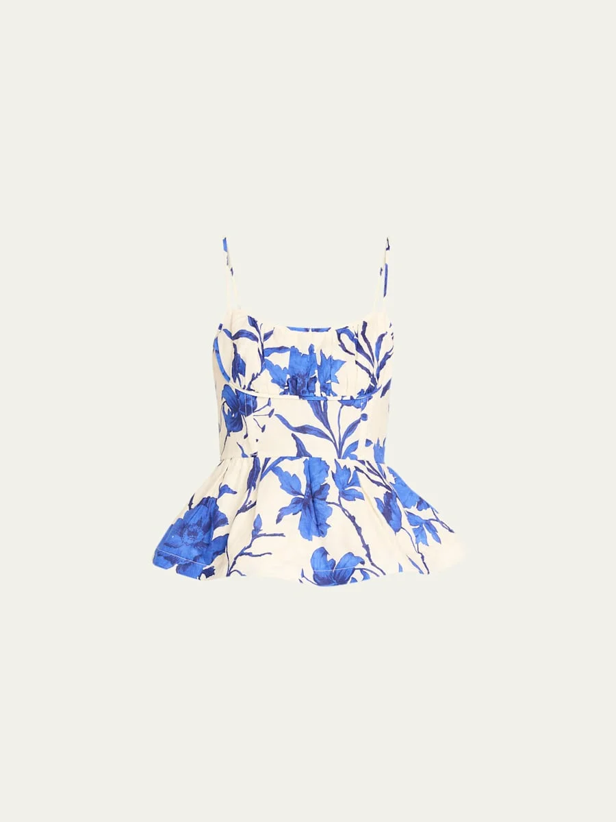 Crafted from breathable linen, the "Alba" top by Cara Cara is adorned with a vibrant Athena Cobalt floral print and boasts a ruched bodice, creating an ultrafeminine silhouette. Sweetheart neckline Adjustable straps Fitandflare Hem sits at the hip Smocked back panel with center zip Linen Lining: Cotton Dry clean Imported