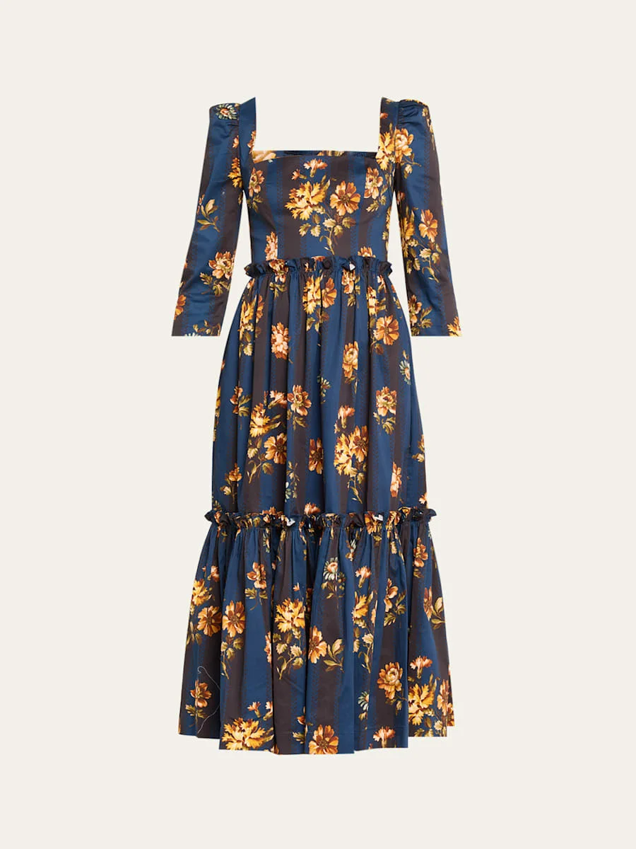 Cara Cara "Blue Hill" toile-print poplin dress with ruffled waist and hem Square neckline 3/4 sleeves Smocked back panel Side slip pockets A-line silhouette Midi length Concealed back zipper Cotton Imported Model is 5'10"/177cm. Online Inquiries: BGS21_T8S81| Store Inquiries: #4354485