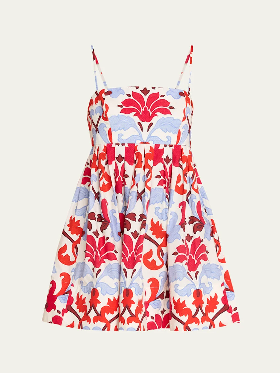 Cara Cara "Leo" printed mini babydoll dress Square neckline Crisscross spaghetti straps; adjustable Smocked back panel Side seam pockets Fitandflare silhouette Hem falls above the knee Invisible back zip Cotton Dry clean Imported