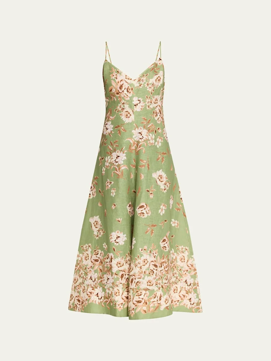Featuring a feminine floral print, the "Mae" linen midi dress by Cara Cara exudes romance with its airy silhouette that can take your look from day to date night with the right accessories. V neckline Adjustable spaghetti straps Fitandflare silhouette Hem falls below the knee Center back zip Linen Dry clean Imported