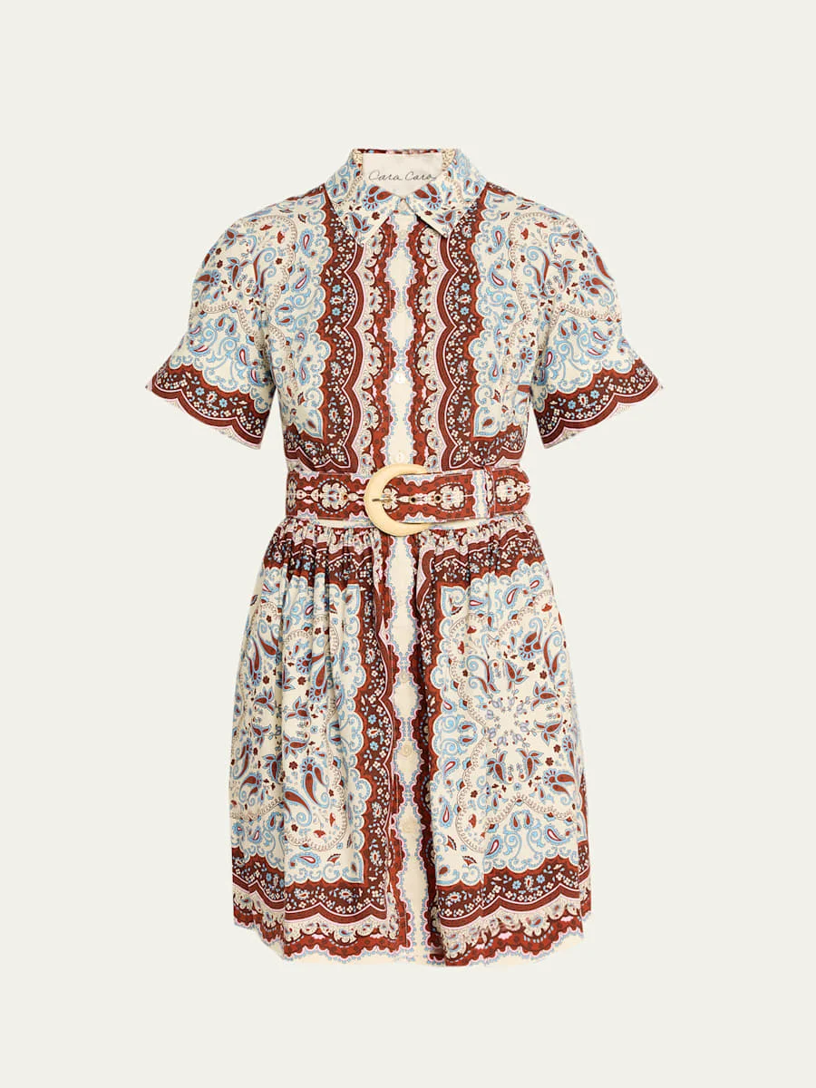 Decorated in an allover paisley print, the "Malena" mini dress by Cara Cara is crafted from breathable cotton and features a removable belt to cinch the waist. Point collar Short sleeves Side pockets Shirtdress silhouette Hem falls above the knee Buttonfront Cotton Dry clean Imported