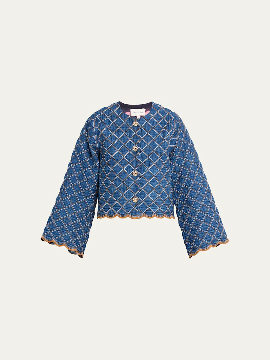 Crafted from quilted denim, the "Marvis" jacket by Cara Cara boasts delicate scalloped edges with contrast topstitching. Round neckline Long sleeves Tailored fit Cropped length Buttonfront Cotton Lining: Cotton Dry clean Imported