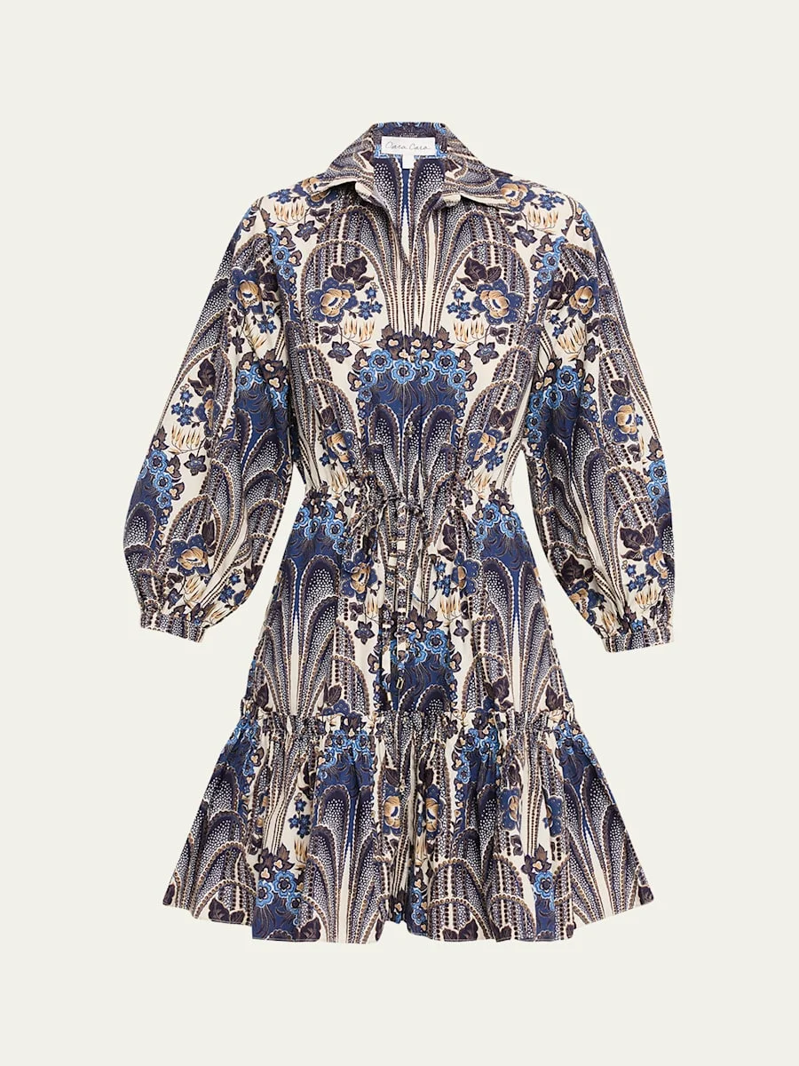 Cara Cara "Robin" floral-print poplin tent dress Spread collar; partial button-front placket 3/4 puff sleeves Drawstring waist Ruffle tiered skirt Mini length A-line silhouette Cotton Unlined Dry clean Made in Peru Model is 5'10"/177cm. Online Inquiries: BGS21_T8S80| Store Inquiries: #4354487