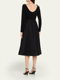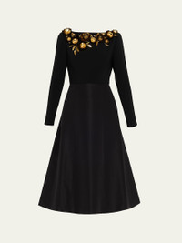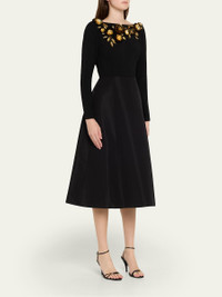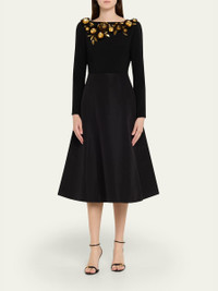 3D Floral Embellished Long-Sleeve Midi Dress